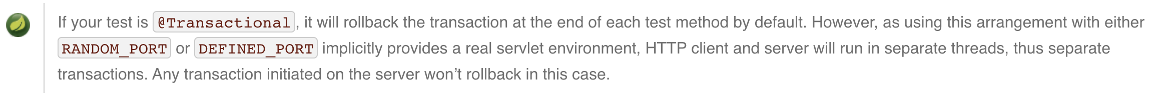 요약하자면 "RANDOM PORT 혹은 DEFINED PORT의 테스트 환경은 진짜 서블릿 환경을 제공하여 HTTP 서버와 클라이언트가 서로 다른 쓰레드에서 동작해 트랜잭션이 분리되어 rollback이 되지 않는다"라는 것이다.