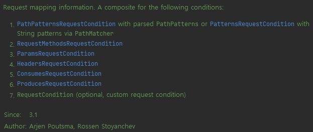 이 메서드의 입력인 RequestMappingInfo를 살펴보면 비로소 실질적인 우선순위가 어떻게 관리되는지 볼 수 있다.