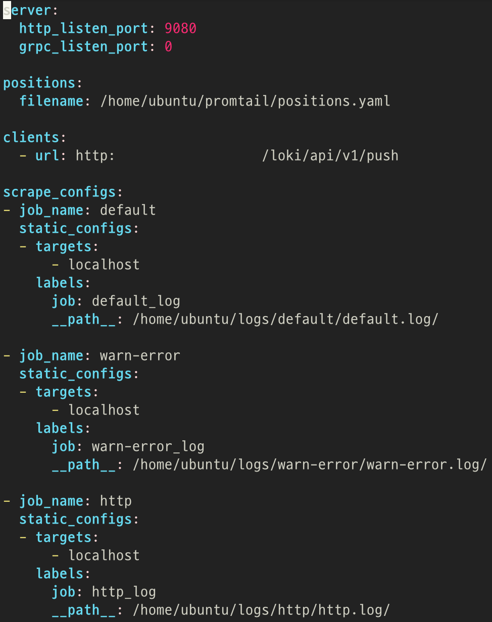 promtail 설정 파일을 위와 같이 구성한 뒤 프로세스를 실행시키면 clients에 명시된 Monitoring server로 각 job에 명시된 파일들을 전송한다. 세 종류의 로그를 각각의 job을 통해 처리하도록 하였다.