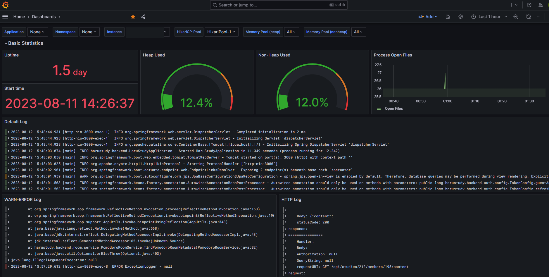 이것으로 손쉽게 SpringBoot 서버에 대한 메트릭을 대시보드로 확인할 수 있게 되었다.