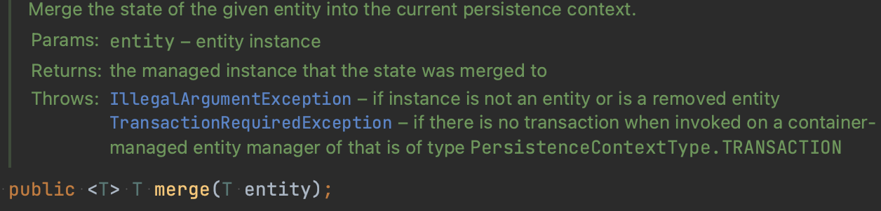 반환된 엔티티 merge()는 명확히 관리되는 entity임을 명시하고 있다.