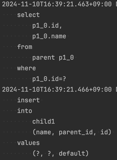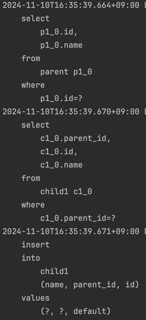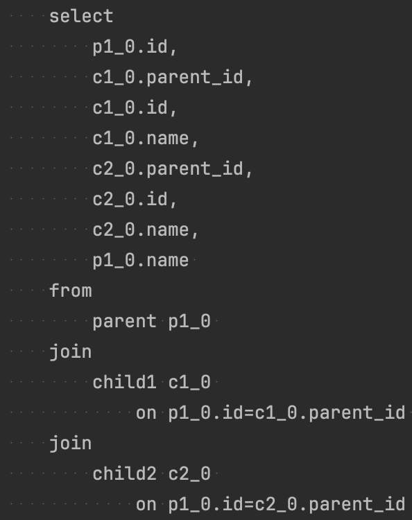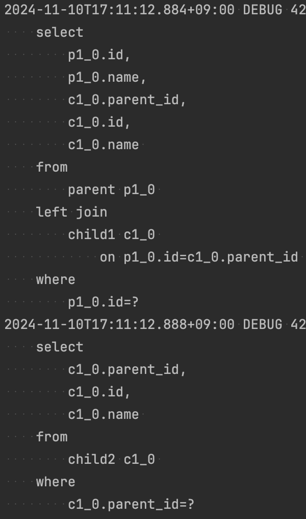 위에서 말했듯 여러 List에 대한 동시 조회는 비용이 너무 비싸므로, 알아서 하나의 List(PersistentBag)에 대해서만 초기화를 하도록 child1을 join 하여 가져오고, 별개의 쿼리로 child2를 가져온다.